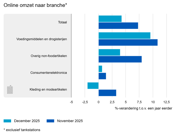 De onlineomzet van winkels in voedingsmiddelen en drogisterijen was bijna 10% hoger dan in december 2024. Ook winkels in overige non-foodartikelen en winkels in consumentenelektronica hebben meer omgezet. De omzet van winkels in kleding- en modeartikelen lag in december 2,0% lager dan in dezelfde maand een jaar eerder.