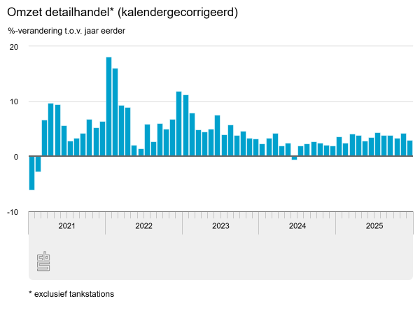 In 2025 heeft de Nederlandse detailhandel 3,6% meer omzet geboekt dan een jaar eerder. Het verkoopvolume was 1,6% hoger dan in 2024. De omzet van de non-foodwinkels groeide in 2025 met 3,6%.