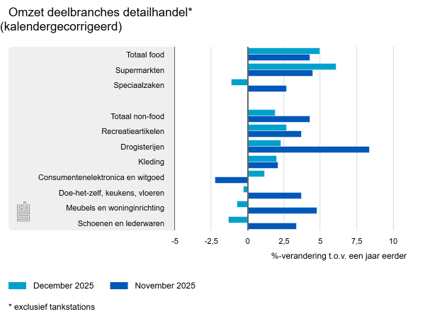 Winkels in voedings- en genotmiddelen hebben in december 5,0% meer omgezet dan in december 2024. Het verkoopvolume was 1,9% hoger dan een jaar eerder. De omzet van supermarkten groeide met ruim 6%, terwijl de omzet van speciaalzaken daalde met 1,1%.