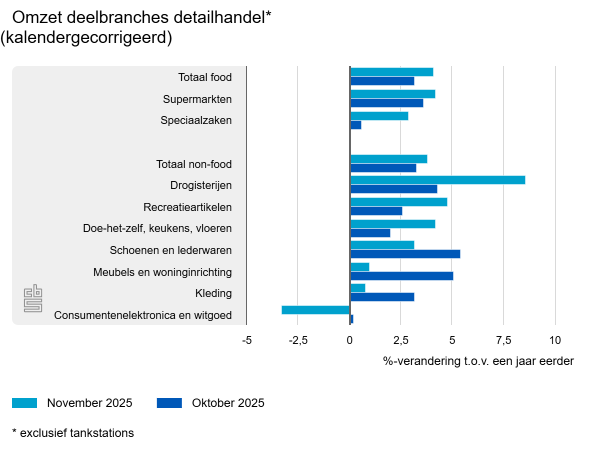 Drogisterijen zetten 8,6% meer om dan dezelfde maand een jaar eerder. De omzet van winkels in recreatieartikelen en winkels in doe-het-zelfartikelen (inclusief keukens en vloeren) groeiden met respectievelijk bijna 5 en ruim 4%. Ook winkels schoenen en lederwaren, winkels in meubels en woninginrichting en winkels in kleding boekten in november 2025 meer omzet dan in november 2024. De omzet van winkels in consumentenelektronica lag in november 2025 lager dan in dezelfde maand een jaar eerder.