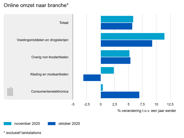 De onlineomzet van winkels in voedingsmiddelen en drogisterijen was 11,5% meer dan in dezelfde maand een jaar eerder. Ook winkels in overige non-foodartikelen, winkels in kleding- en modeartikelen en winkels in consumentenelektronica hebben online meer omzet geboekt dan in november 2024.