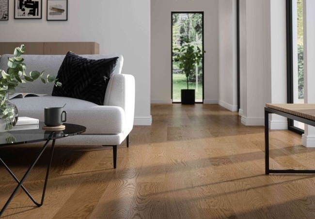 'Lichte afwerkingen en gelaagde, warm getinte verlichting vormen een prachtige aanvulling op de diepte van het hout.' In de praktijk kan dit betekenen dat donkere eikenhouten vloeren worden gecombineerd met crèmekleurige muren, messing accenten en zachte stoffen om een elegante maar toegankelijke esthetiek te creëren.