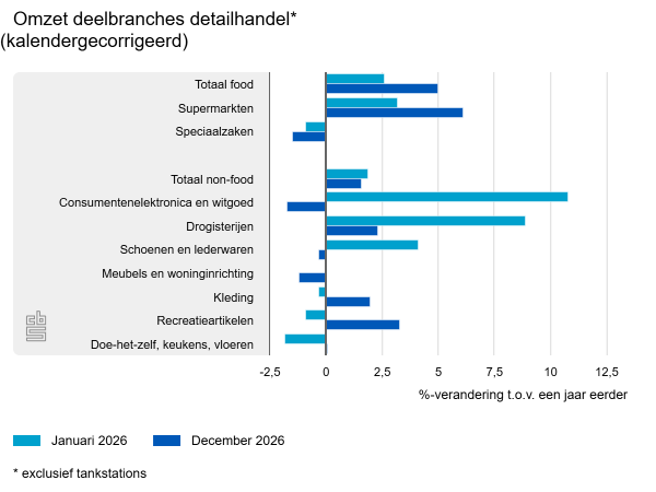 Winkels in consumentenelektronica zetten 10,8% meer om dan in dezelfde maand een jaar eerder. Drogisterijen en winkels in schoenen en lederwaren groeiden met respectievelijk bijna 9 en ruim 4%. De omzet van winkels in meubels en woninginrichting was hetzelfde als een jaar eerder. De omzet van winkels in kleding, winkels in recreatieartikelen en winkels in doe-het-zelfartikelen (inclusief keukens en vloeren) lag in januari 2026 echter lager dan in dezelfde maand een jaar eerder.
