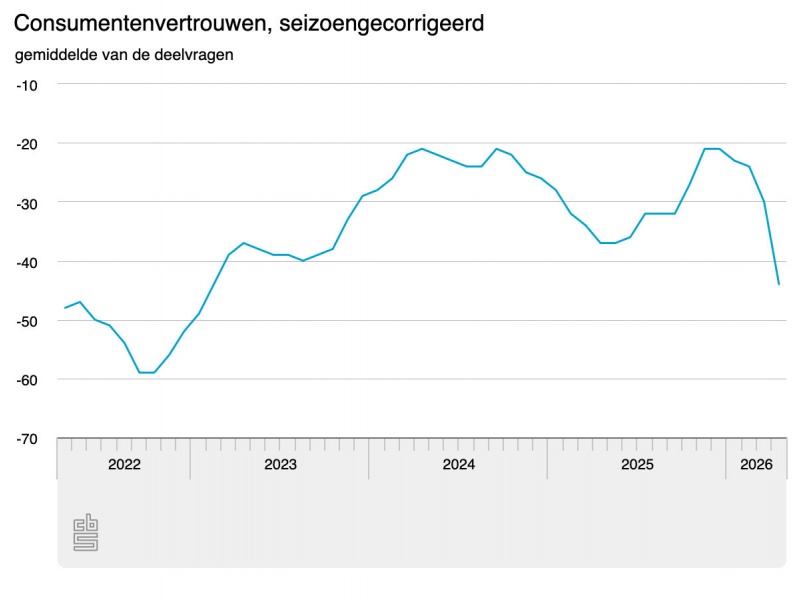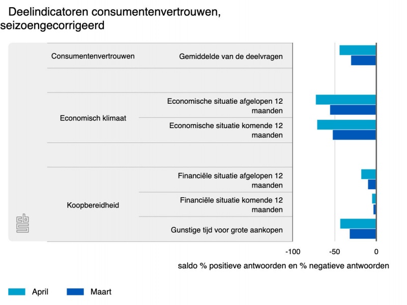 Consumenten zijn in april fors negatiever over de economie dan in maart. De deelindicator economisch klimaat daalt van -54 naar -72. Alleen van augustus tot en met oktober 2022 waren consumenten negatiever over de economie. In april 2026 verslechtert zowel het oordeel over de economische situatie in de komende twaalf maanden als het oordeel over de economische situatie in de afgelopen twaalf maanden sterk.