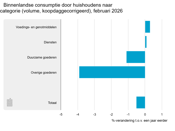 In februari 2026 hebben huishoudens in Nederland 0,5% minder goederen en diensten aangeschaft dan in februari 2025, meldt het CBS. Een maand eerder kromp de consumptie met 0,3%. De consumptiecijfers betreffen volumecijfers. Dat wil zeggen dat ze zijn gecorrigeerd voor prijsveranderingen.