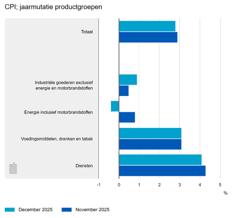 De Nederlandse inflatie in december 2025 was 2,8% bij een snelle raming, zo meldt het CBS. Deze raming is berekend op basis van nog onvolledige brongegevens. In november was de inflatie 2,9%.