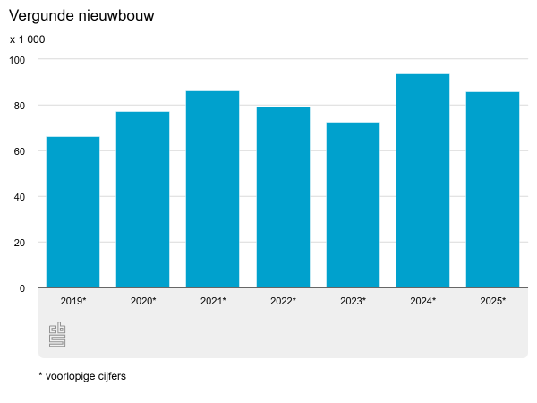 In 2025 is voor bijna 86 duizend nieuwbouwwoningen een vergunning afgegeven. Ondanks dat afgelopen twee jaren meer vergunningen dan in de vijf jaar daarvoor zijn verleend, leidt dat niet direct tot meer nieuwbouw. Het duurt steeds langer om nieuwe woningen te bouwen nadat er een vergunning is afgegeven. Bovendien worden sommige vergunningen later weer ingetrokken. Sinds 2019 schommelt dit tussen de drie en vijf procent.