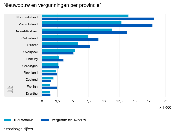 In Noord-Holland zijn in 2025 de meeste nieuwbouwwoningen gebouwd, en de meeste vergunningen afgegeven. Verder zijn in elke provincie meer vergunningen afgegeven dan er nieuwbouw gereedgekomen is, behalve in Overijssel en Zeeland.
