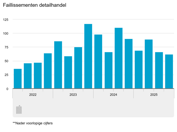 In het vierde kwartaal van 2025 zijn 62 detailhandelaren failliet verklaard. Een jaar eerder waren dat er 90. In totaal zijn er onder bedrijven, instellingen en eenmanszaken 828 faillissementen uitgesproken. In het laatste kwartaal van 2024 waren dat er bijna 1.050, waarvan ongeveer 9% detailhandelaren.