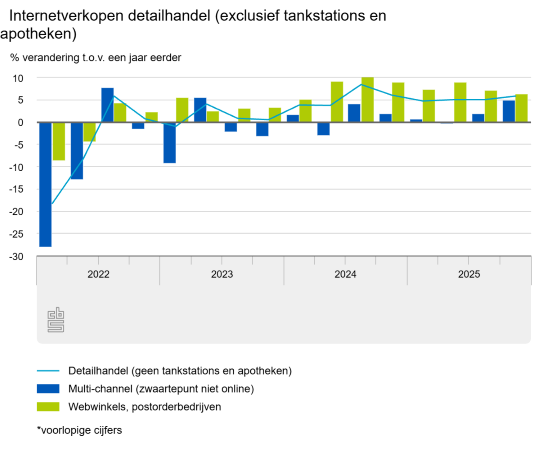 Detailhandelaren zetten online 5,8% meer om dan in dezelfde periode een jaar eerder. Bij winkels die alleen online verkopen is dat zelfs 6,4%. Detaillisten die hun producten online en in een fysieke winkel verkopen (multichannelers) boeken 4,9% meer omzet.