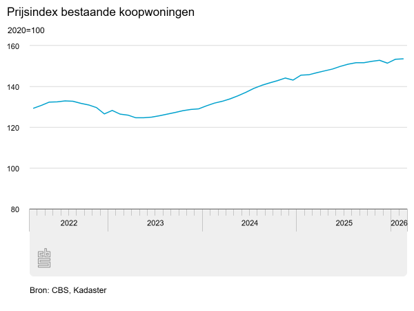 In februari waren de prijzen van bestaande koopwoningen gemiddeld 5,4% hoger dan een jaar eerder. Dat is gelijk aan de prijsstijging jaar op jaar in januari. Ten opzichte van januari 2026 stegen de prijzen in februari gemiddeld met 0,1%. De prijsontwikkelingen in dit bericht zijn gebaseerd op de prijsindex van bestaande particuliere koopwoningen in Nederland van het Centraal Bureau voor de Statistiek (CBS) en het Kadaster.