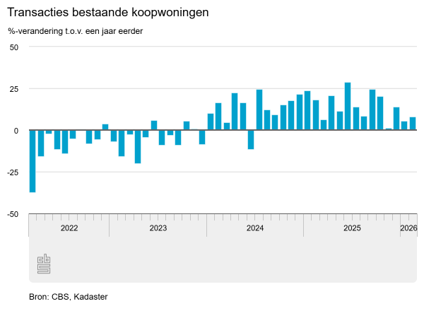 Het Kadaster maakte bekend dat het in februari 17.675 woningtransacties registreerde. Dat is ruim 8% meer dan een jaar eerder. In de eerste twee maanden van 2026 zijn 36.568 woningen verkocht, bijna 7% meer dan een jaar eerder.