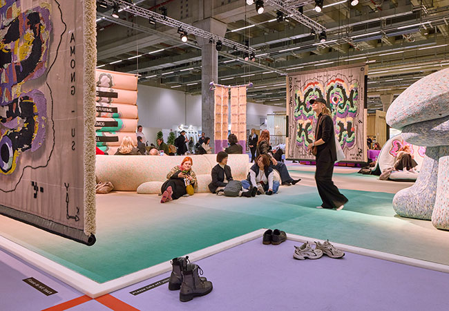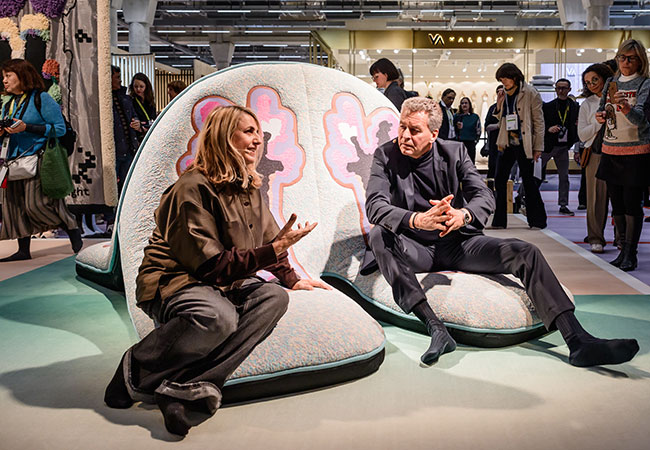 De wereldberoemde architecte en ontwerpster Patricia Urquiola (foto 1 links, naast Messe Frankfurt directeur Detlef Braun) zet nieuwe normen in textielinterieurontwerp: met haar meeslepende installatie ‘Among-all’ (foto 2) in hal 3.0 creëert ze een textielervaring voor alle zintuigen, waarbij ze esthetiek, comfort, functionaliteit en duurzaamheid combineert. De installatie laat zien hoe AI-gestuurd design inspeelt op individuele menselijke behoeften en innovatieve ruimtelijke concepten mogelijk maakt voor design, retail en hospitality. ‘among-all’ benadrukt de emotionele en visuele kracht van textiel en nodigt bezoekers uit om zich te laten inspireren, even stil te staan en contact te maken.